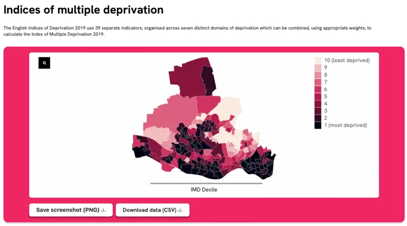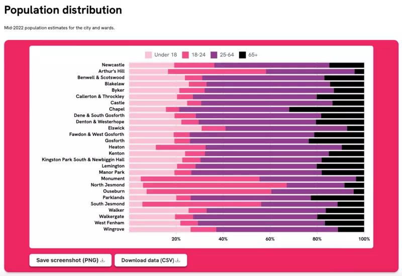 To understand the Newcastle region better, we added a Regional data section to the website. This includes national statistics for Newcastle that were extracted, processed and visualised using data from the Office for National Statistics. This page breaks down the demographic and socio-economic makeup of Newcastle such as age, income indices of multiple deprivation (IMD) and benefit claimants - all potential influences, or barriers, for cultural participation.