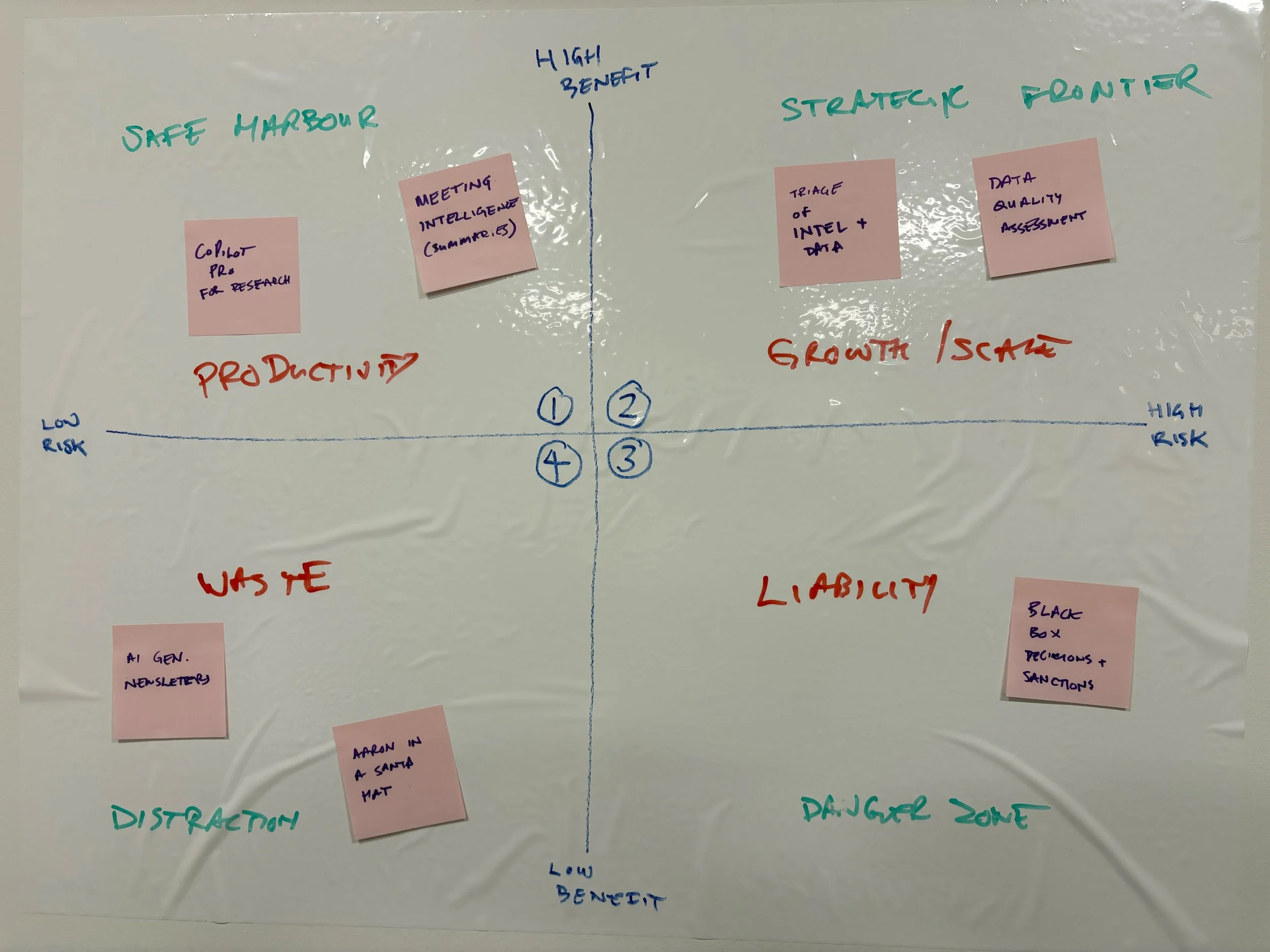 Safe Harbour (Productivity): Low-risk wins like meeting summaries and research to build organizational literacy.